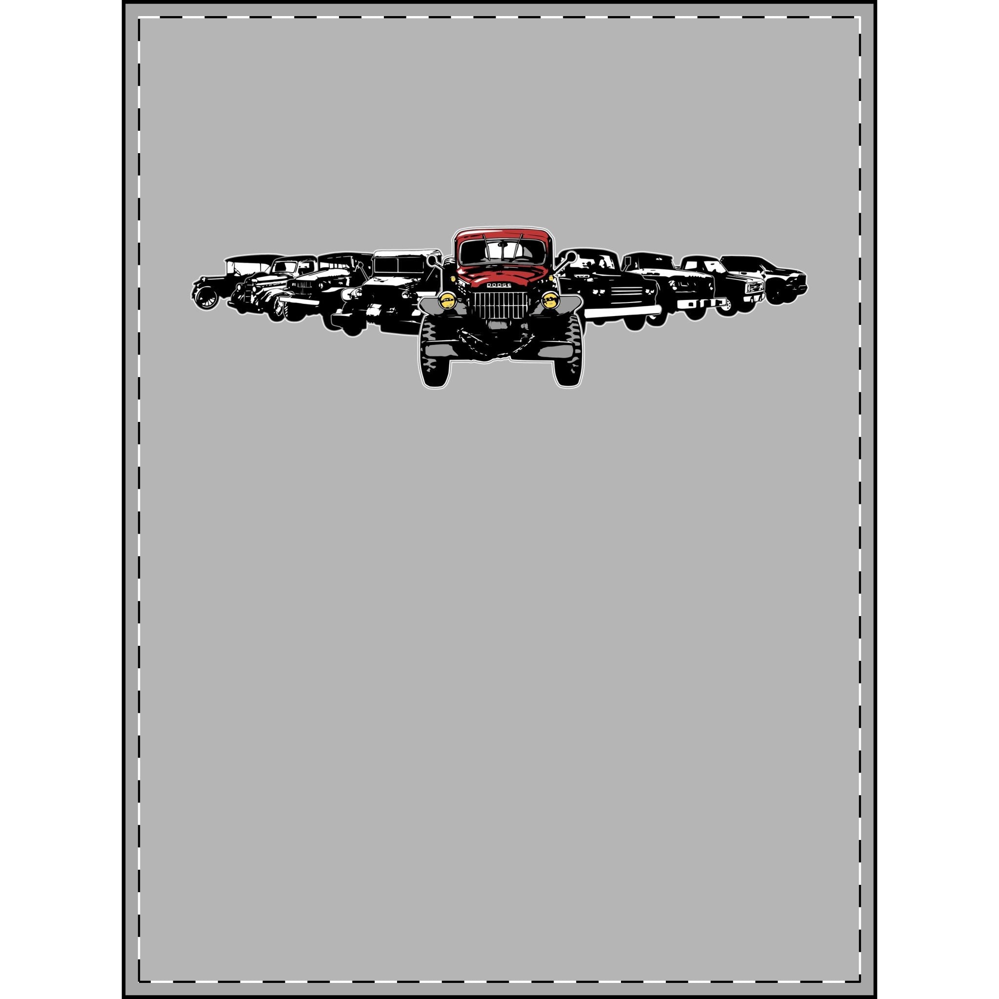 Originally created for our 2014 Rally shirt celebrating 100 years of Dodge, this lineup showcases the iconic progression of Dodge trucks with a strong focus on the legendary Power Wagon lineage. From the 1914 Dodge to the WC ½-ton and WC ¾-ton trucks that inspired the Power Wagon, through the Power Giant era, the classic civilian Power Wagons, and on to today’s modern Power Wagon, this artwork honors the evolution and enduring legacy of these unmistakable trucks.